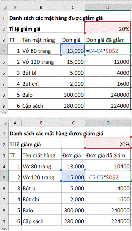 c) Nhập công thức cho các ô từ D5 đến ô D10 để tính đơn giá mỗi mặt hàng sau khi đã được giảm, biết tỉ lệ giảm được lưu ở ô D2.