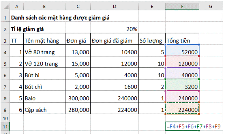 f) Tại ô F11, hãy nhập công thức tính Tổng tiền phải trả cho tất cả các mặt hàng.