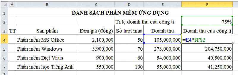 Thực hiện sao chép công thức tại ô E4 đến ô E5, E6, E7, E8, E9 sẽ giúp em tính toán doanh thu cho các phần mềm còn lại mà không cần gõ công thức vào từng ô. Sau khi sao chép, địa chỉ ô trong công thức sẽ tự động thay đổi.