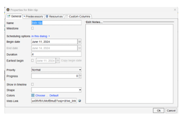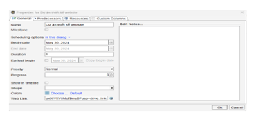 Người quản lí dự án tạo ra các thư mục dùng chung của dự án trên Google Driver, phân quyền truy cập, chỉnh sửa phù hợp cho các thành viên của dự án. Sau đó thực hiện kết nối từng nhiệm vụ với thư mục dữ liệu liên quan tại trang Ganeral trong hộp thoại Task Properties.