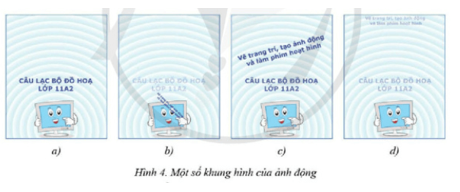 Hình 4 minh hoạ một số khung hình của một ảnh động với hai văn bản có hiệu ứng khác nhau. Văn bản “CÂU LẠC BỘ ĐỒ HOẠ LỚP 11A2” có hiệu ứng nhấp nháy (ẩn, hiện). Văn bản thứ hai chạy từ vị trí màn hình máy tính lên trên đồng thời phóng to và quay 360”, sau đó thu nhỏ lại, chạy lên trên rồi biến mất. Hãy tạo ảnh động này hoặc ảnh động khác với các hiệu ứng tự điều khiển theo ý thích. Lưu ảnh các khung hình và xuất ảnh động GIF.
