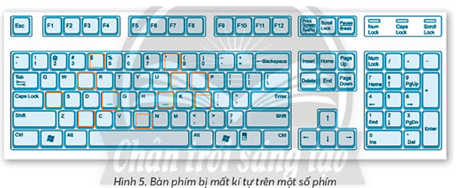 Bàn phím máy tính ở Hình 5 bị mất kí tự trên một số phím. Em hãy ghi kí tự đã mất vào các phím.