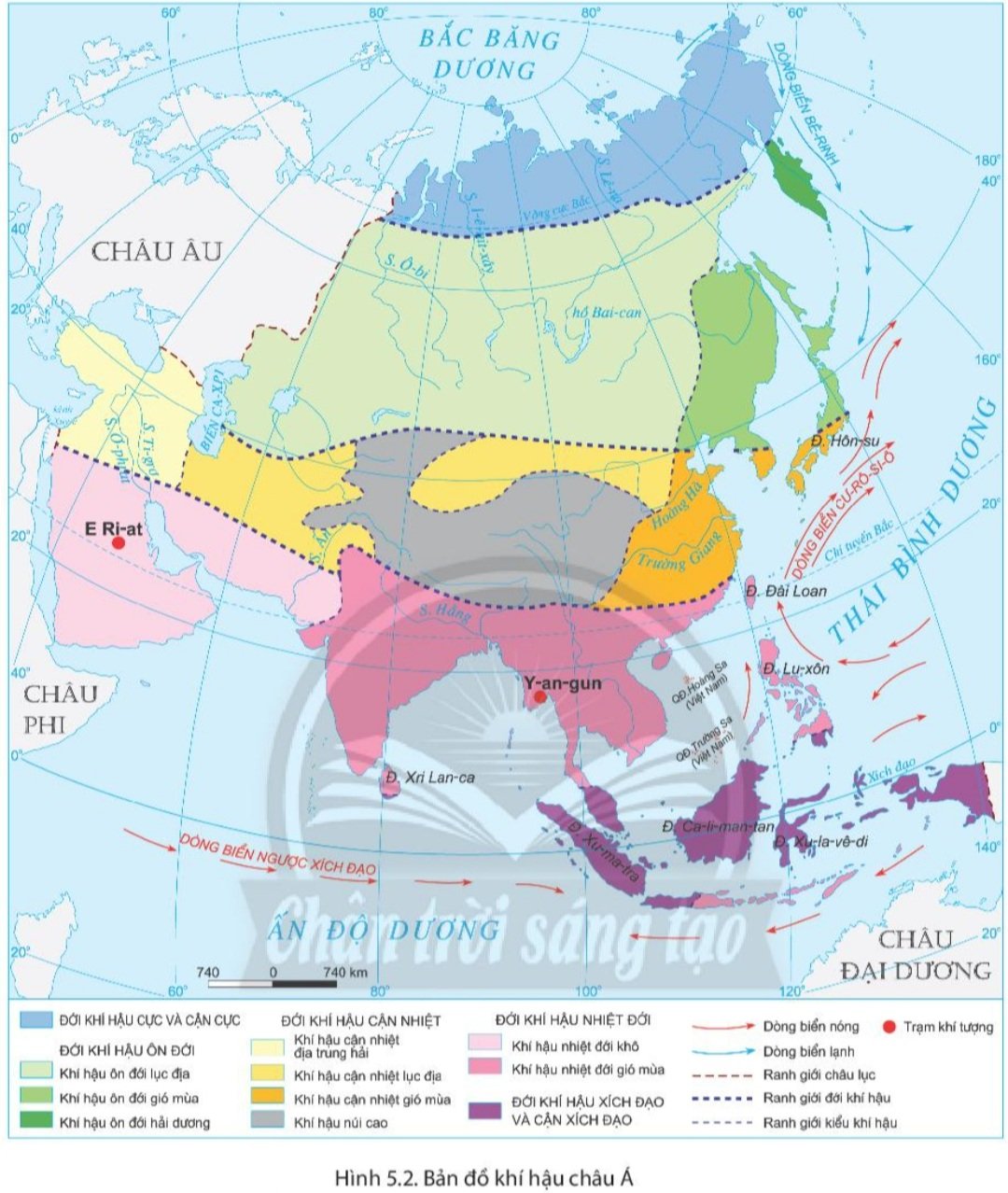 - Quan sát hình 5.2 để xác định vị trí hai trạm khí tượng E Ri-at (Riyagh) và Y-an-gun (Yangon).