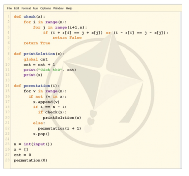 Tìm hiểu chương trình giải quyết bài toán xếp hậu bằng kĩ thuật quay lui trong Hình 4, giải thích ý nghĩa các hàm check, printSolution, permutation và chạy thử nghiệm với n = 4, 5, 8 và 10.