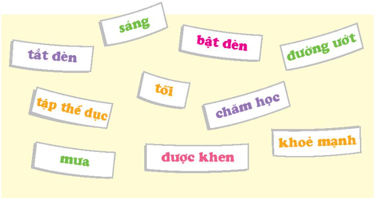 Tìm từ ngữ có mối liên hệ với nhau. (Mẫu: bật đèn – sáng)