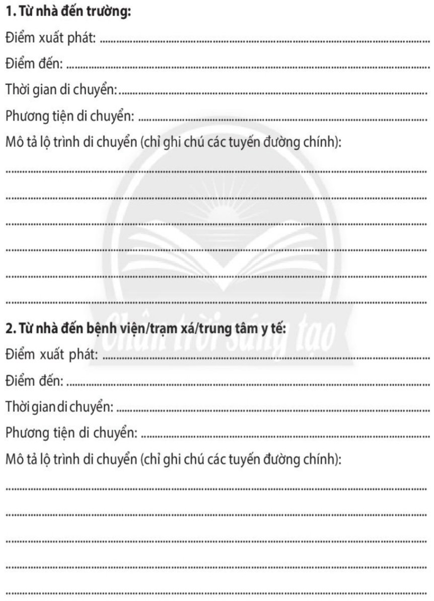 - Học sinh tự xác định các tuyến đường từ nhà mình đến trường và từ nhà đến một bệnh viện/trạm xá/trung tâm y tế gần khu vực đang sinh sống.