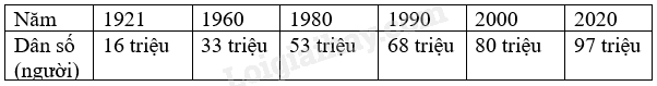 Theo nguồn http://www.worlddometers.info, bạn Bình thống kê dân số Việt Nam (đơn vị: người) qua các năm 1921, 1960, 1980,1990, 2000 và 2020 lần lượt là 16 triệu, 33 triệu, 540 trăm nghìn, 68 triệu, 80 triệu, 97 triệu.