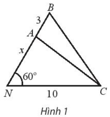 Khoảng cách từ nhà An ở vị trí N đến cột điện C là 10 m. Từ nhà, An đi x mét theo phương tạo với NC một góc \(60^\circ \) đến vị trí A sau đó đi tiếp 3 m đến vị trí B như hình 1.