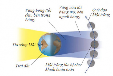 - Nhật thực: Khi Mặt Trời, Mặt Trăng và Trái Đất cùng nằm trên một đường thẳng, mặt trăng ở giữa thì trên Trái Đất xuất hiện bóng tối và bóng nửa tối.