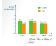 Biểu đồ cột kép ở Hình 21 biểu diễn số tiền Việt Nam thu được khi xuất khẩu cà phê và xuất khẩu gạo trong ba năm 2017, 2018, 2019.