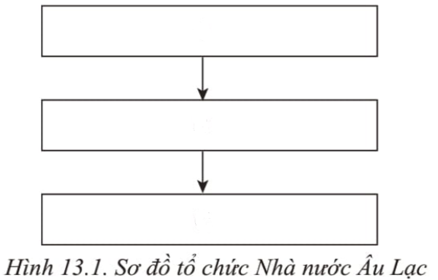 Đặt các từ ngữ cho sẵn vào các ô A, B, C để boàn thành sơ đồ tổ chức nhà nước Âu Lạc. Hãy chỉ ra những điểm giống và khác nhau giữa tổ chức Nhà nước Âu Lạc và tổ chức Nhà nước Văn Lang. (1) Bộ (Đứng đầu mỗi bộ là Lạc tướng): (2) Chiềng, chạ (Đứng đầu là Bồ chính), (3) An Dương Vương (Nắm mọi quyền hành, giúp việc có các Lạc hầu).