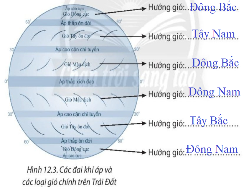 2. Dựa vào hình 12.3, em hãy cho biết hướng của các loại gió chính trên Trái Đất ở hai bán cầu.