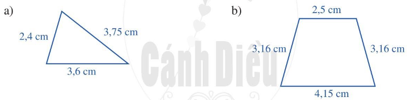 a) Chu vi hình tam giác là: \(2,4 + 3,75 + 3,6 = 9,75\) (cm).