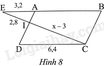 Suy ra \(\frac{{IE}}{{IC}} = \frac{{AE}}{{DC}}\) hay \(\frac{{2,8}}{{x - 3}} = \frac{{3,2}}{{6,4}}\), suy ra \(x - 3 = 5,6\), do đó \(x = 8,6\)