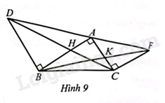 Cho tam giác \(ABC\) vuông ở \(A\). Vẽ ra phía ngoài tam giác đó các tam giác \(BAD\) vuông cân ở \(B\), \(ACF\) vuông cân ở \(C\). Gọi \(H\) là giao điểm của \(AB\) và \(DC\), \(K\) là giao điểm của \(AC\) và \(BF\) (Hình 9). Chứng minh: