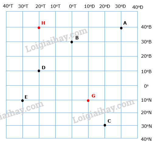 b) Xác định vị trí của các địa điểm trên hình: G(10 độ N, 10 độ Đ); H (40 độ B, 20 độ T).