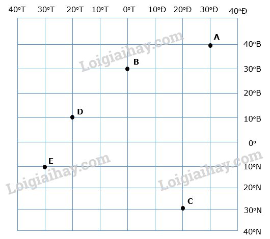 a) Hãy xác định tọa độ địa lí và ghi lại tọa độ địa lí của các điểm A, B, C, D, E.