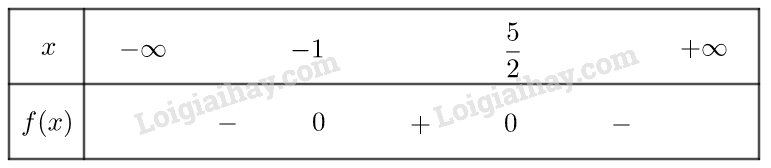 Vậy \(f\left( x \right)\) âm trong khoảng \(\left( { - \infty ; - 1} \right)\) và \(\left( {\frac{5}{2}; + \infty } \right)\), dương trong khoảng \(\left( { - 1;\frac{5}{2}} \right)\)