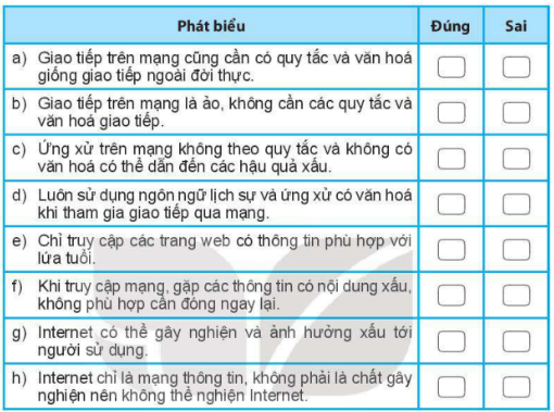 Đánh dấu X vào cột Đúng/Sai tương ứng.