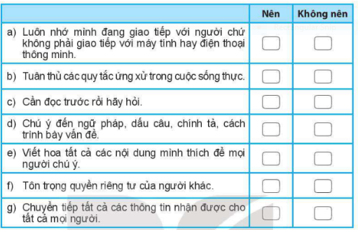 Để trở thành người giao tiếp, ứng xử có văn hóa trên mạng em nên/không nên thực hiện những điều nào sau đây? Đánh dấu X vào ô tương ứng: