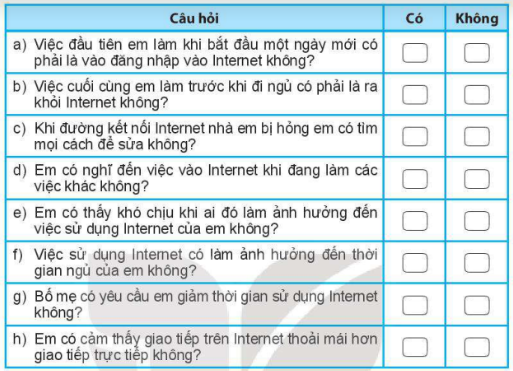 Tất cả các biểu hiện liệt kê trong bảng đều là dấu hiệu cho thấy một người bị ảnh hưởng không tốt bởi Internet. Nếu hầu hết các câu trả lời của em là “không” thì chúc mừng em. Nếu câu trả lời “có” nhiều hơn “không” thì em cần trao đổi với bố mẹ và người thân về vấn đề này để nhận được sự hỗ trợ cần thiết, giúp em tránh được những ảnh hưởng không tốt và phụ thuộc vào Internet.