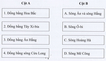 Câu 8. Nối tên đồng bằng ở cột A với tên dòng sông chính bồi đắp nên đồng bằng đó ở cột B sao cho đúng