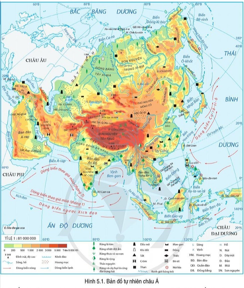 Hãy xác định các khu vực địa hình (núi, cao nguyên, sơn nguyên, đồng bằng) và các khoáng sản chính, các sông lớn của châu Á trên hình 5.1.