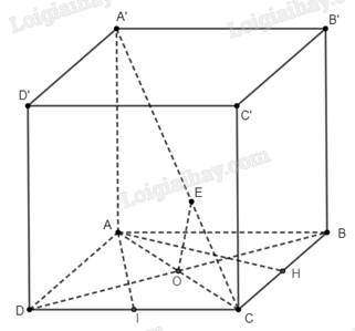 c) Gọi \(O\) là giao điểm của \(AC\) và \(BD\). Gọi \(E\) là hình chiếu của \(O\) trên \(A'C\). Ta chứng minh \(OE\) là đường vuông góc chung của 2 đường thẳng \(BD\) và \(A'C\), từ đó khoảng cách cần tính là đoạn thẳng \(OE\).