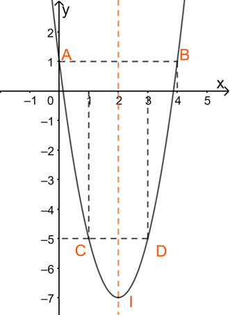 + Điểm đối xứng với A(0;1) qua trục đối xứng \(x = 2\) là B(4;1)