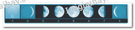 Hình dưới đây ghi lại hình dạng Mặt Trăng quan sát được trong các ngày của tháng Âm lịch. Hãy xác định các ảnh 1, 2, 3, 5, 7, 8 ứng với khoảng ngày nào của tháng Âm lịch.