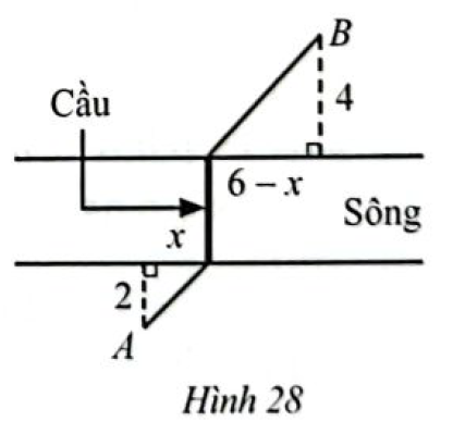 Hai địa điểm A và B cách hai bởi một con sông (coi hai bờ sông song song). Người ta muốn xây một chiếc cầu bắc vuông góc với bờ sông để có thể đi từ A đến B. Với các số liệu (tính theo đơn vị km) cho trên Hình 28, tìm \(x\) (km) để xác định vị trí đặt chân cầu sao cho khoảng cách từ B đến chân cầu phía B gấp đôi khoảng cách từ A đến chân cầu phía A.