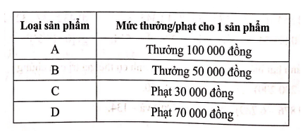Bác Toàn làm được 40 sản phẩm loại A, 35 sản phẩm loại B, 15 sản phẩm loại C và 10 sản phẩm loại D. Vậy bác Toàn được thưởng hay phạt trung bình bao nhiêu tiền trên mỗi sản phẩm?