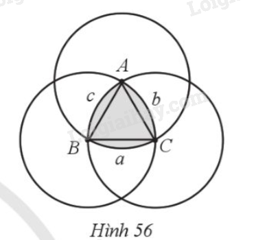 Tam giác Reuleaux là hình tạo nên từ phần giao nhau của ba đường tròn cùng bán kính, tâm của mỗi đường tròn chính là giao điểm của hai đường tròn còn lại. Tạo tam giác Reuleaux từ ba đường tròn (A), (B), (C) (Hình 56). Tính số đo các cung nhỏ BaC, CbA, AcB của tam giác Reuleaux. Nêu nhận xét về số đo của các cung tròn đó.