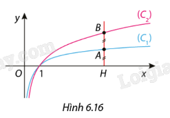 Cho đồ thị của hai hàm số \(y = {\log _a}x\); \(y = {\log _b}x\) lần lượt là (C1) và (C2) (Hình 6.16). Tìm hệ thức liên hệ giữa a và b, biết mọi đường thẳng song song với trục tung, cắt trục hoành, (C1), (C2) lần lượt tại H, A, B thì A là trung điểm của BH.
