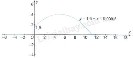 Quỹ đạo chuyển động của một quả bóng được cho bởi công thức (y = 1,5 + x - 0,098{x^2}), trong đó y (mét) là độ cao của quả bóng so với mặt đất và x (mét) là khoảng cách theo phương ngang từ vị trí của quả bóng đến vị trí ném (xem hình bên). Tính khoảng cách theo phương ngang từ vị trí ném bóng đến vị trí quả bóng chạm đất.