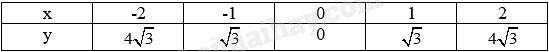 Biểu diễn các điểm \(\left( { - 2;4\sqrt 3 } \right);\left( { - 1;\sqrt 3 } \right);\left( {0;0} \right);\left( {1;\sqrt 3 } \right);\left( {2;4\sqrt 3 } \right)\) trên mặt phẳng tọa độ Oxy và nối chúng lại ta được đồ thị hàm số \(y = \sqrt 3 {x^2}\) như hình vẽ.