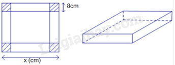 Khi cắt bỏ bốn hình vuông có độ dài cạnh 8cm ở bốn góc và gập lại, thu được một hình hộp chữ nhật có độ dài các cạnh đáy lần lượt là \(x - 16;x - 16\) và chiều cao là 8cm.