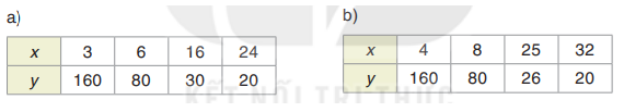 b) Ta có: 4.160 = 8. 80 = 32.20 \( \ne \)25.26 nên 2 đại lượng x, y không là hai đại lượng tỉ lệ nghịch.