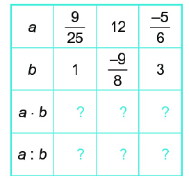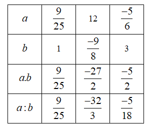 \(\begin{array}{l}a.b = 12.\dfrac{{ - 9}}{8} = \dfrac{{12.\left( { - 9} \right)}}{{.8}} = \dfrac{{ - 27}}{2}\\a:b = 12:\dfrac{{ - 9}}{8} = 12.\dfrac{8}{{ - 9}} = \dfrac{{12.8}}{{ - 9}} = \dfrac{{ - 32}}{3}\end{array}\)
