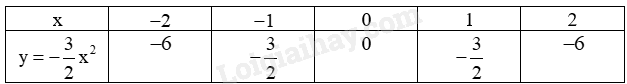 Biểu diễn các điểm \(\left( { - 2; - 6} \right);\left( { - 1; - \frac{3}{2}} \right);\left( {0;0} \right);\left( {1; - \frac{3}{2}} \right),\left( {2; - 6} \right)\) trên mặt phẳng tọa độ Oxy và nối chúng lại ta được đồ thị hàm số \(y = - \frac{3}{2}{x^2}\).