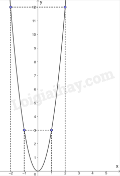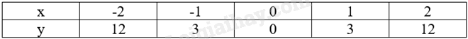 Biểu diễn các điểm \(\left( { - 2;12} \right);\left( { - 1;3} \right);\left( {0;0} \right);\left( {1;3} \right);\left( {2;12} \right)\) trên mặt phẳng tọa độ Oxy và nối chúng lại ta được đồ thị hàm số \(y = 3{x^2}\) như hình vẽ