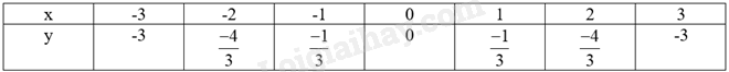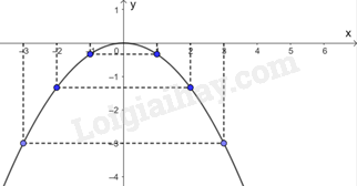 Biểu diễn các điểm \(\left( { - 3; - 3} \right);\left( { - 2;\frac{{ - 4}}{3}} \right);\left( { - 1;\frac{{ - 1}}{3}} \right);\left( {0;0} \right);\left( {1;\frac{{ - 1}}{3}} \right);\left( {2;\frac{{ - 4}}{3}} \right);\left( {3; - 3} \right)\) trên mặt phẳng tọa độ Oxy và nối chúng lại ta được đồ thị hàm số \(y = - \frac{1}{3}{x^2}\) như hình vẽ.