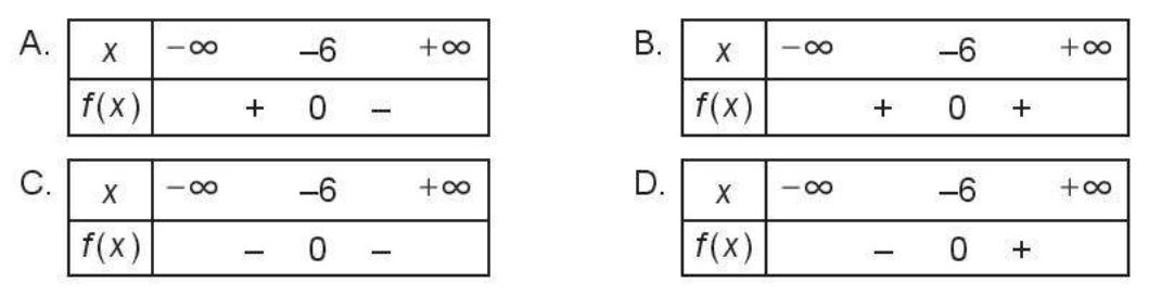 Bảng xét dấu nào sau đây là bảng xét dấu của tam thức \(f(x) = {x^2} + 12x + 36\)?
