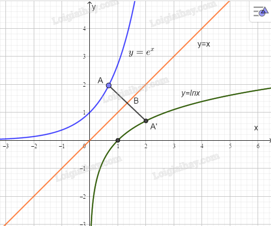 Gọi \(A'\) là điểm đối xứng của \(A\) qua đường thằng \(y = x\). Ta tìm được \(A'\left( {{e^{{x_0}}};{x_0}} \right)\). Khi đó \(A'\) thuộc đồ thị hàm số \(y = {\rm{ln}}x\). Tương tự nếu điếm \(B\left( {{x_0}{\rm{;ln}}{x_0}} \right)\) nằm trền đồ thị hàm số \(y = {\rm{ln}}x\) thì ta cũng có thể tìm toạ độ của điềm \(B'\) đối xứng với \(B\) qua đường thẳng \(y = x\) và chứng minh \(B'\) thuộc đồ thị hàm số \(y = {e^x}\).