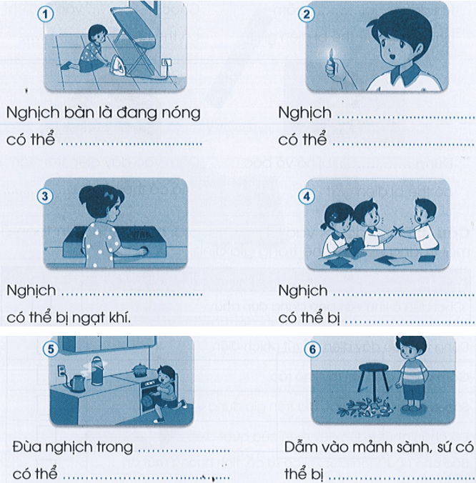 Chọn nội dung gợi ý và điền vào chỗ … để mô tả những nguy hiểm có thể xảy ra tương ứng với từng bức tranh dưới đây.