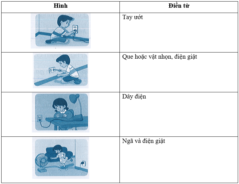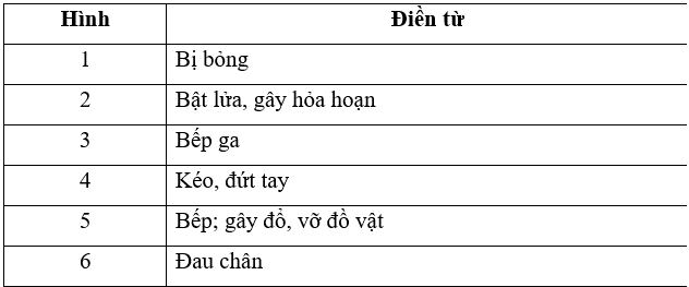 Chọn nội dung gợi ý và điền vào chỗ …… để mô tả những nguy hiểm có thể xảy ra tương ứng với từng bức tranh dưới đây.