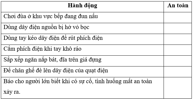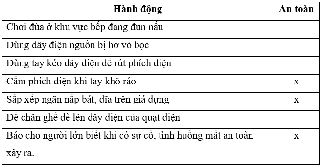 Đánh dấu x vào □ phù hợp với hành động an toàn ở môi trường công nghệ trong gia đình.