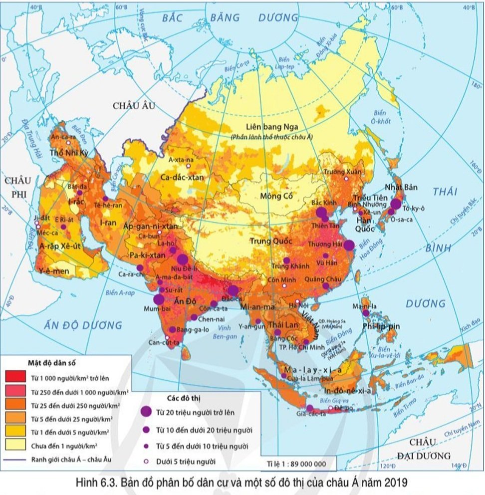 Đọc thông tin và quan sát bảng 6.2, hình 6.3, hãy xác định các khu vực đông dân và thưa dân ở châu Á. Kể tên và xác định các đô thị trên 20 triệu dân ở châu Á.