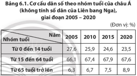 - Nhận xét cơ cấu dân số theo nhóm tuổi của châu Á giai đoạn 2005 - 2020: