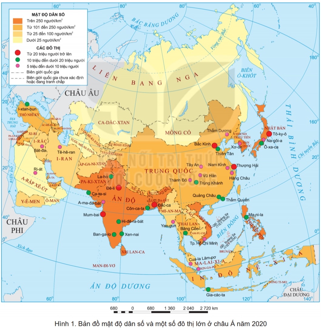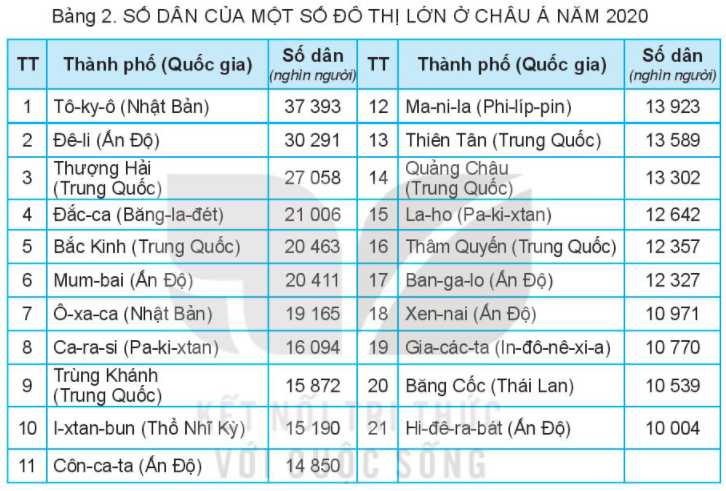 - Xác định vị trí các đô thị từ 20 triệu người trở lên ở châu Á.